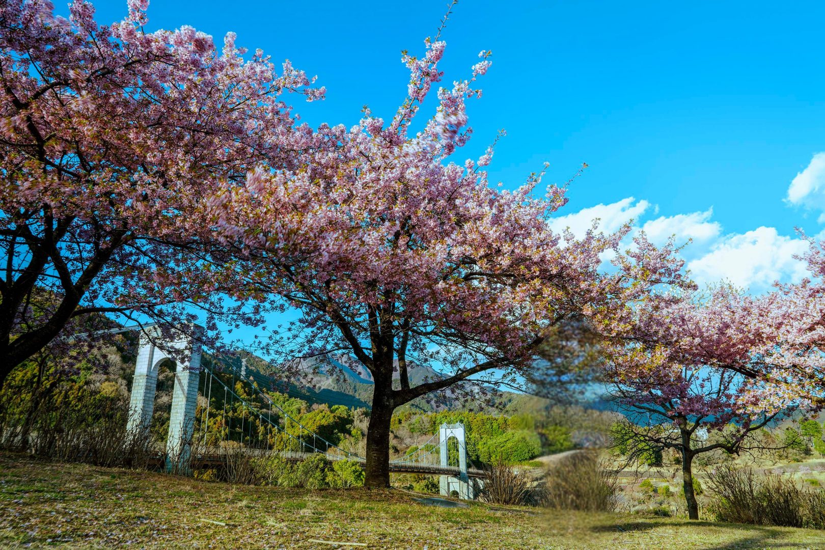 その秦野戸川公園へのアクセスは、「渋沢駅北口」からバスで約15分。終点の「大倉」バス停付近が、秦野戸川公園の入口となります。広さ36.1haを誇る都市公園であり、水無川の上にかかる「風の吊り橋」がランドマークとして親しまれています。