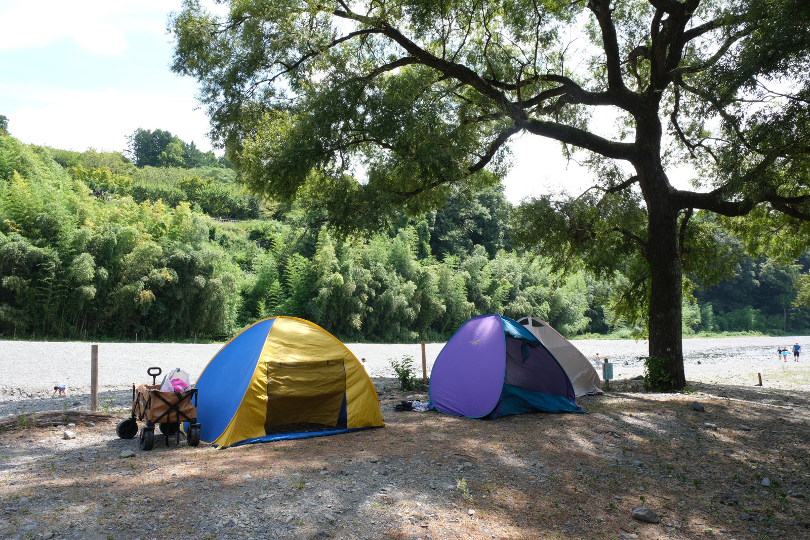 河原では、ポップアップ式テントの設置、利用も可能です。熱中症に気をつけて、休憩しながら川遊びを楽しみましょう。自然の川ですので、山間部の降雨などで急に水量が増加する場合があります。公園のアナウンスに注意しながら、楽しみましょう。