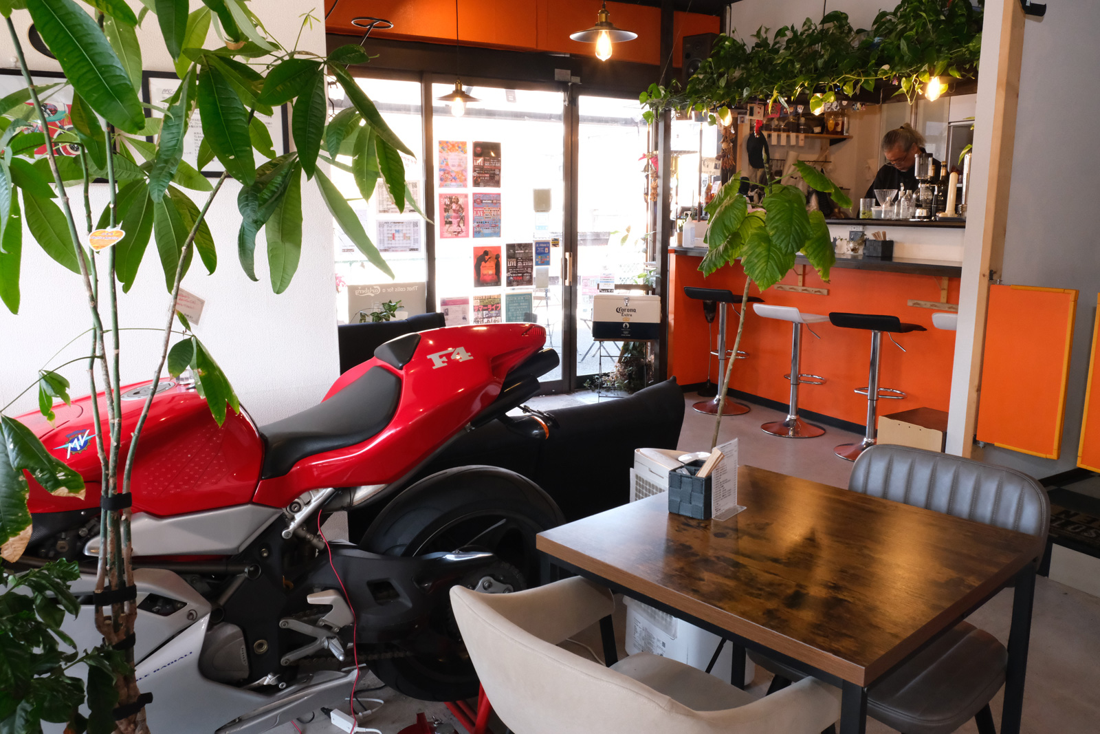 店内に入ると、まず大きな赤いオートバイが目に入ってきます。「走る宝石」と呼ばれた車体は、バイク通でなくとも、その美しい形に見惚れてしまいます。イタリア製のこの希少なバイクを見るために、県外からお客さまが訪れることもあるのだとか。