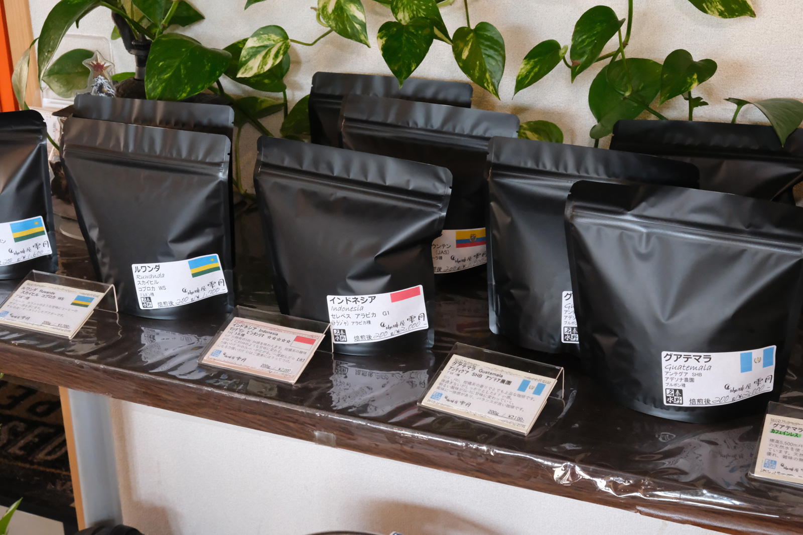 自家焙煎したコーヒー豆は、店頭で購入することができます。南米やアフリカ、アジアなどコーヒー豆の産地から、生産する農園も厳選して選定した生豆を焙煎していらっしゃるとのこと。