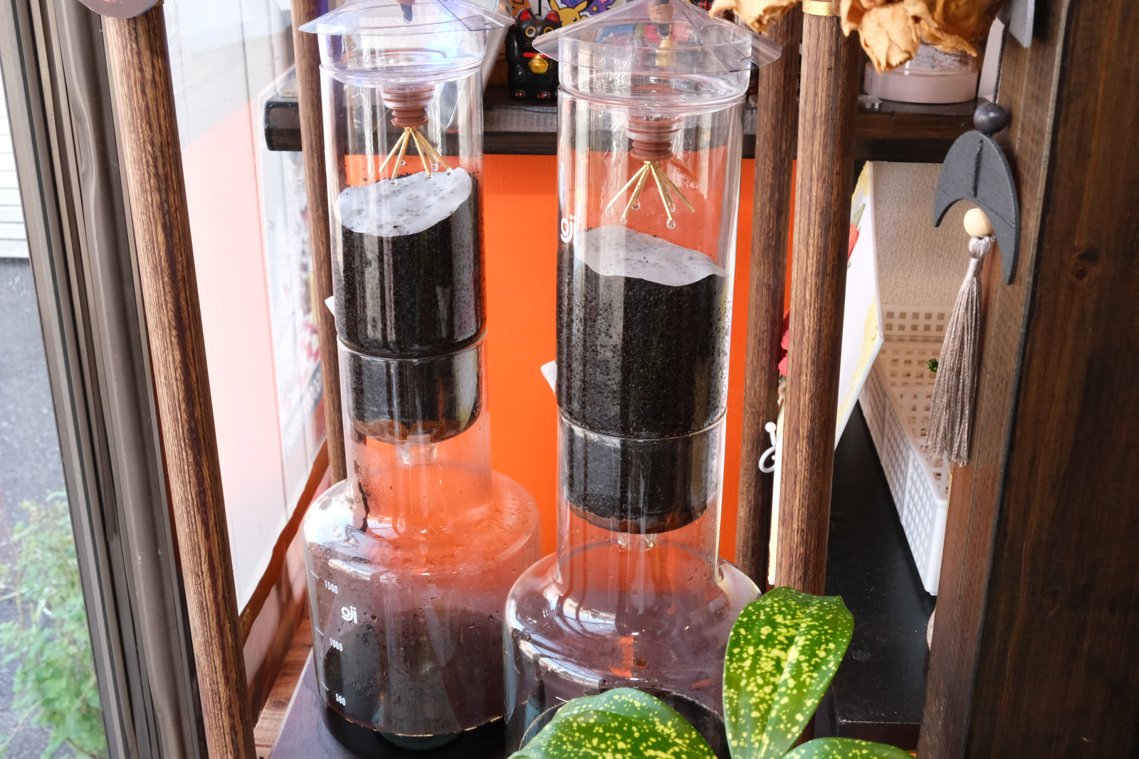 そんな美味しい秦野の名水を使用し、なんと10時間もの時間をかけて抽出されるのが人気メニュー「アイスダッチコーヒー」です。カウンター席の隣に設けてある専用機で、アイスコーヒー用にブレンドした自家焙煎豆に、時間をかけて一滴ずつ浸透させ、水出しで抽出しています。温度を加えないため、油分も出にくく、豆がもつ本来の味を楽しむことができるのだそう。カフェインレス(デカフェ)のアイスダッチコーヒーを選ぶこともできます。