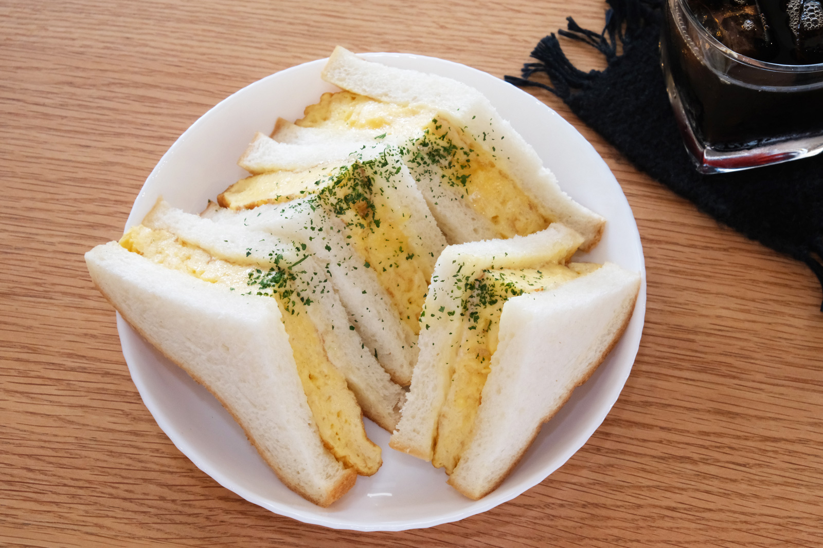 軽食的なフードメニューも充実しています。なかでも「厚焼きたまごサンド」は、世代を問わず人気の一品。パン以上の厚さのたまご焼きは、オーダーが入ってから店主自ら調理し、熱々で提供。当初は、パンの耳はカットしていたそうですが、昨今のフードロス問題も鑑み、現在は耳つきのまま提供しているとのこと。パンとたまご焼きの間に塗られた「からしマヨネーズ」は、辛さはなく、ほんのりと香る程度。見た目以上のボリューム感で食べ応えのあるサンドイッチは、ランチやおやつにぴったりですね。