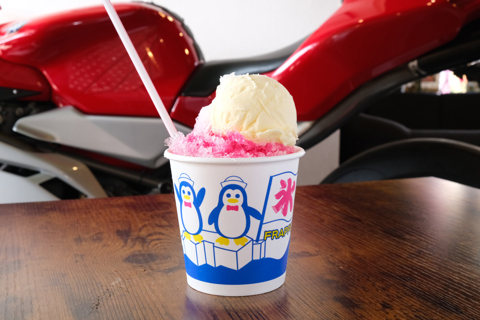 シロップは、いちごやレモン、ブルーハワイなど定番が揃っています。秦野の水で作った氷、ほのぼのと懐かしい美味しさを感じます。写真のようにアイスクリームや練乳のトッピング(有料)もできます。