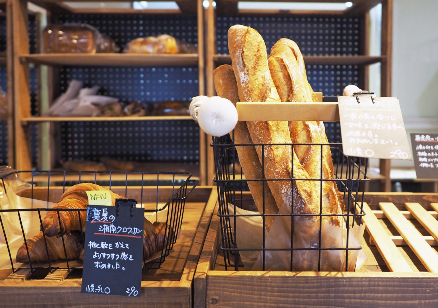 ショーケースの上に並ぶのは食パン、フォカッチャ、クロワッサンなど。一番のオススメという「湘南バゲット(写真右)」は、湘南小麦ならではの香りと甘みを存分に味わうことができます。