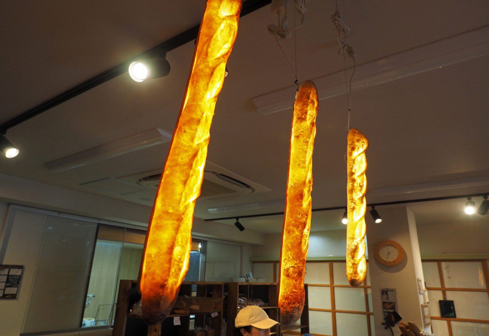 レジカウンターの上の細長いライトは美術作家さんの作品で、フードロスで廃棄される前のバゲットを利用し、中をくりぬいてLEDランプシェードに仕立てた「パンライト」だそうです。(※作品に使用されているバゲットはPlaisirプレジール千穂のものではありません)