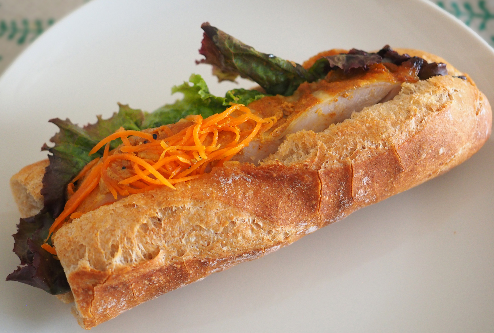 食事用からスイーツ系まで揃うバゲットサンドも人気です。国産鶏のモモ肉をオリジナルブレンドのスパイス、調味料に漬け込んで焼いた「タンドリーチキンサンド(写真左)」は、ほどよくスパイシーなチキンとたっぷりの野菜で食べ応えのあるサンドイッチ。