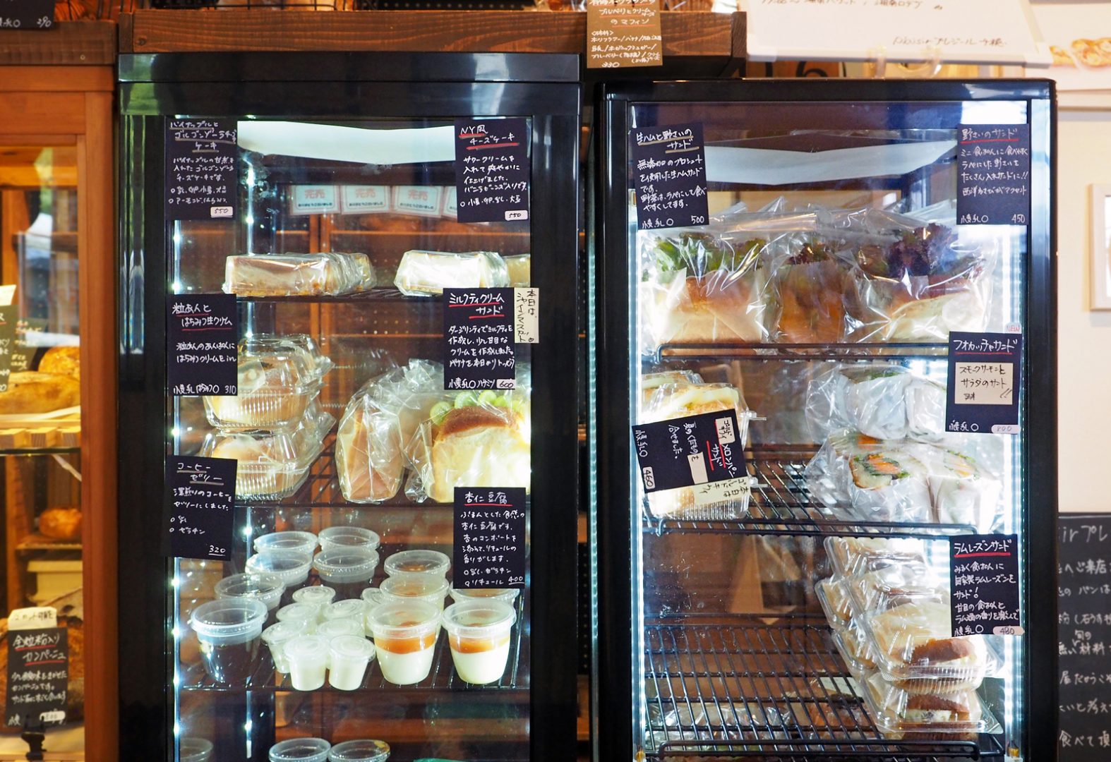 8時半の開店前から次々とパンが焼き上がり、11時頃にかけて40~50種類のパンがショーケースに勢ぞろいします。隣のチルドケースには、スモークサーモンや生ハムのサンドイッチ、フルーツと生クリームのサンドイッチなどのほか、チーズケーキやコーヒーゼリーといったデザート類も並びます。