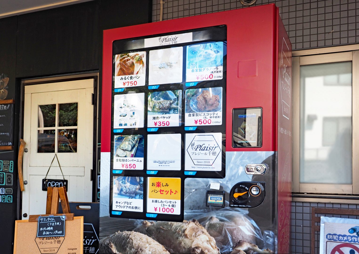 店舗の入口横には、「冷凍自動販売機」が設置されており、焼きたての美味しさのまま密封パックし、急速冷凍したパンが販売されています。品揃えはその都度変わりますが、「全粒粉カンパーニュ(写真右)」や「湘南バゲット」、「ミルク食パン」などの他に、自販機でしか購入できないグラノーラやビスコッティも販売されています。お店の営業日以外でも購入できるのが有難いですね。