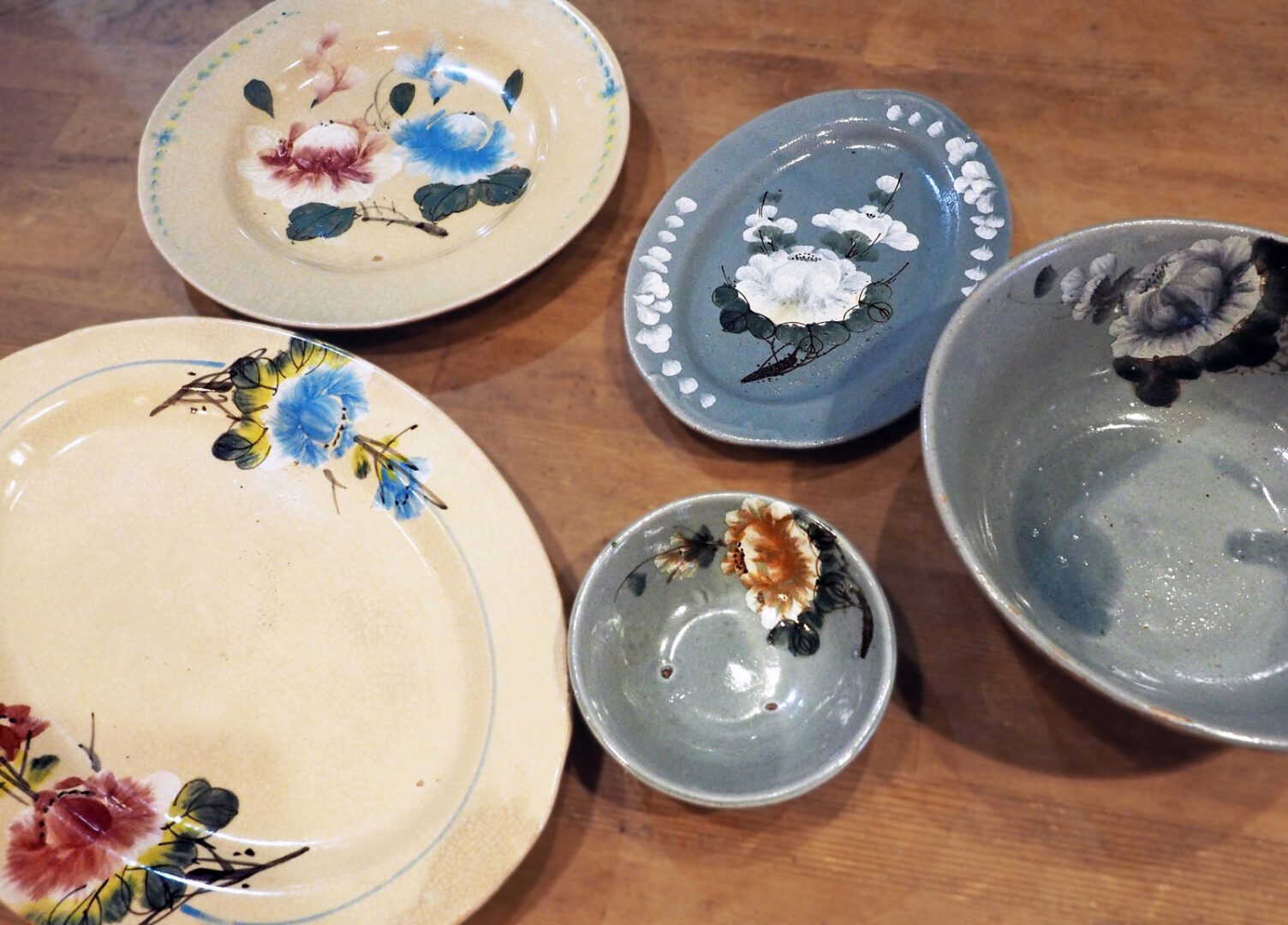 料理を盛り付ける器も魅力的です。「ザラザラした手触りが好きなんです」とトゥイさんが語る、ベトナム南部の代表的な焼き物「ソンべ焼き」で、手描きで絵付けされた花柄の温かい色調、ぽってりとした素朴な風合いが特徴です。