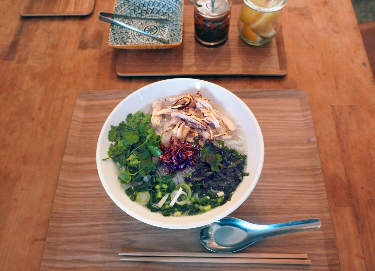 そら屋の「鶏肉のフォー」は、豚骨と鶏ガラ、玉ねぎをじっくりと煮こんだスープで、香ばしく炙った蒸し鶏に焦がし玉ねぎ、パクチー、長ねぎが添えられています。シンプルな塩味ながら、深いコクと旨味があり、スープを最後まで飲み干せるほどの美味しさです。お好みでレモンを絞り、自家製サテ(米油に唐辛子やニンニクなどを加えヌクマムで調味したラー油)を少し加えると、キリっとした味わいへの変化を楽しむことができます。