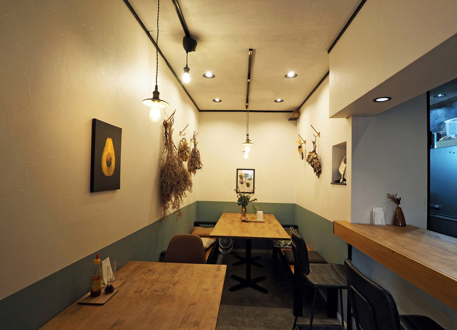 ターコイズブルーのドアを開けて店内に入ると、北欧調のオフホワイトとブルーグレーの壁にモダンな絵画やスワッグが飾られた居心地のよい空間が広がっていて、お洒落なカフェの雰囲気です。カウンター席もあるので、お一人でも気軽に立ち寄って食事を楽しむことができます。