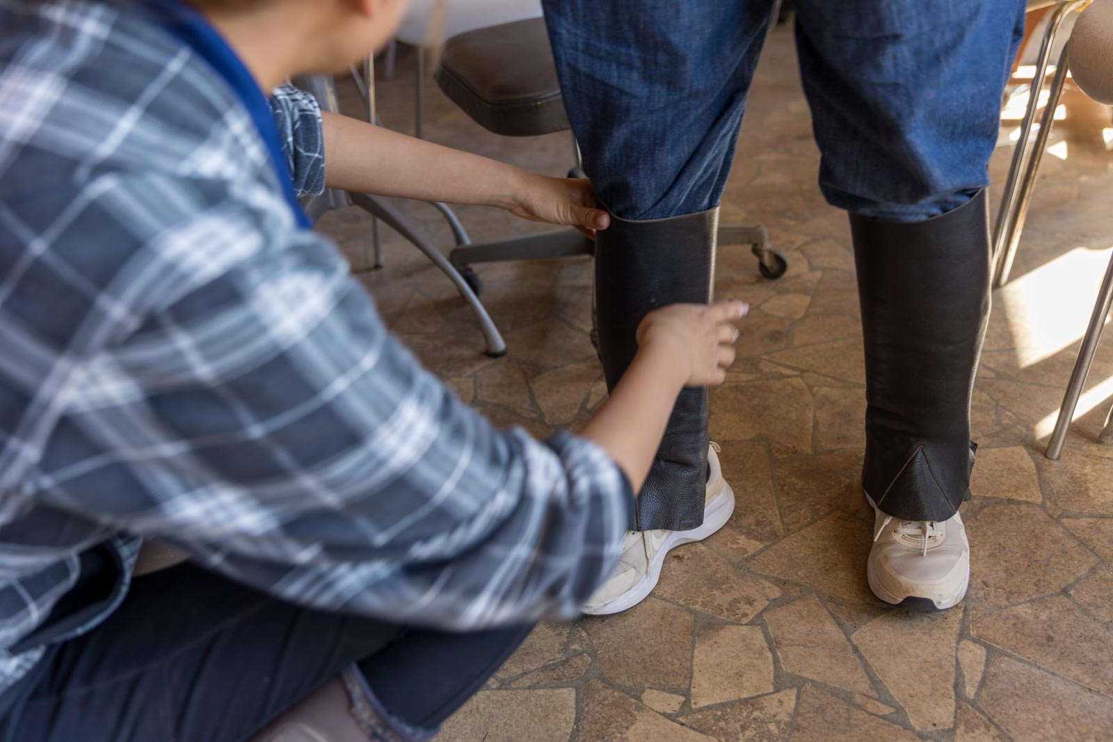 まず身につけるのは、ズボンの上から巻くチャップス。足首から膝下までを保護するだけでなく、ふくらはぎで馬の体をしっかり挟めるようサポートしてくれる役割もあります。初めての方はチャップスで十分ですが、本格的な乗馬ではロングブーツを着用するのが正式なスタイルなのだそう。