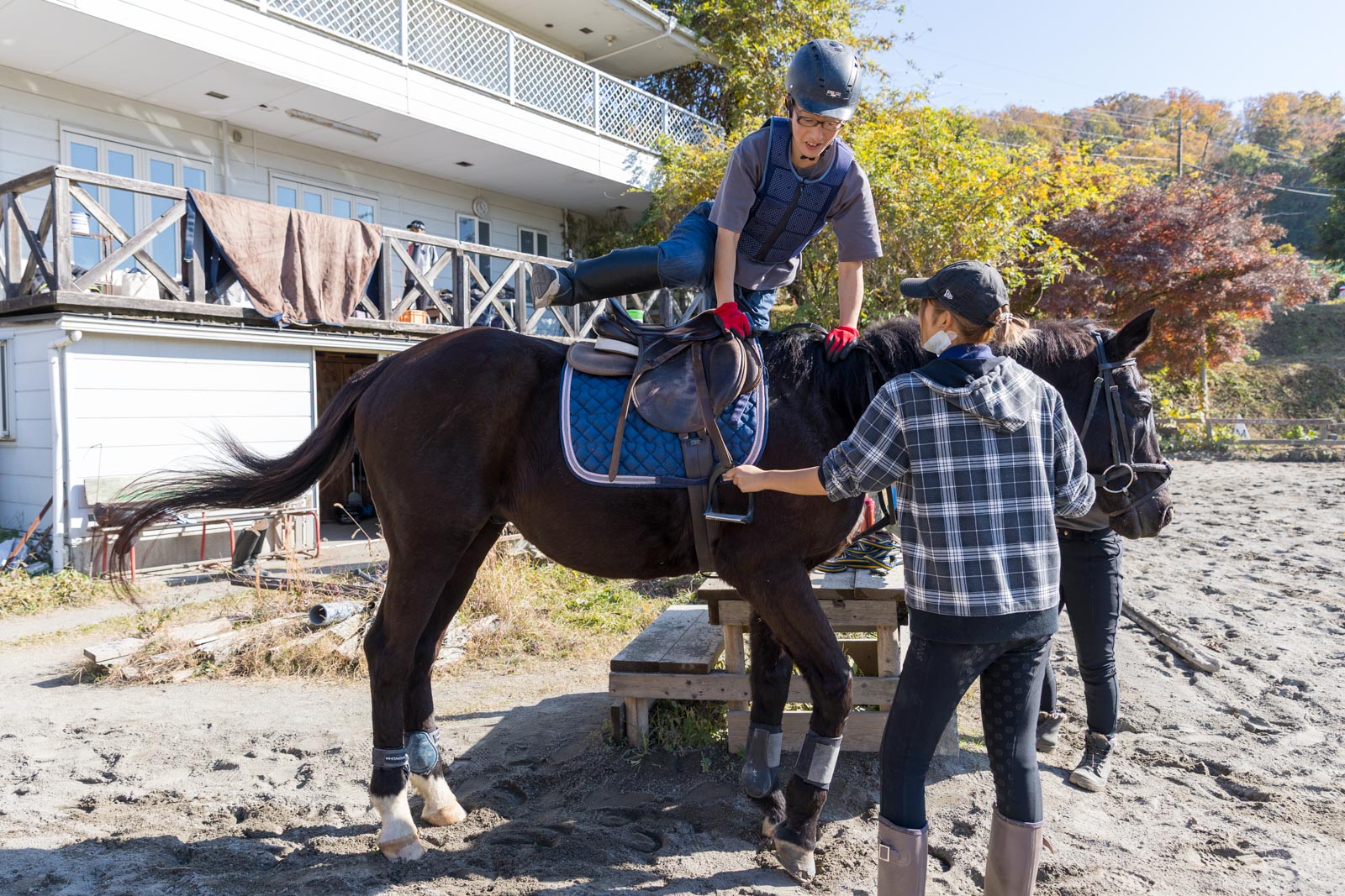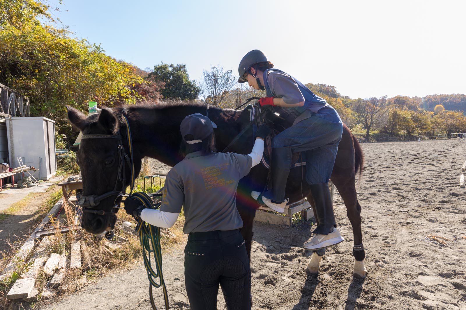 最後は常歩に戻してゆっくりと馬場を一周し、体験乗馬は終了。馬を降りるときは右足を大きく後ろへ回し、鞍に体を預けながら左足を外して着地します。あっという間の30分でしたが、充実感でいっぱいになりました。