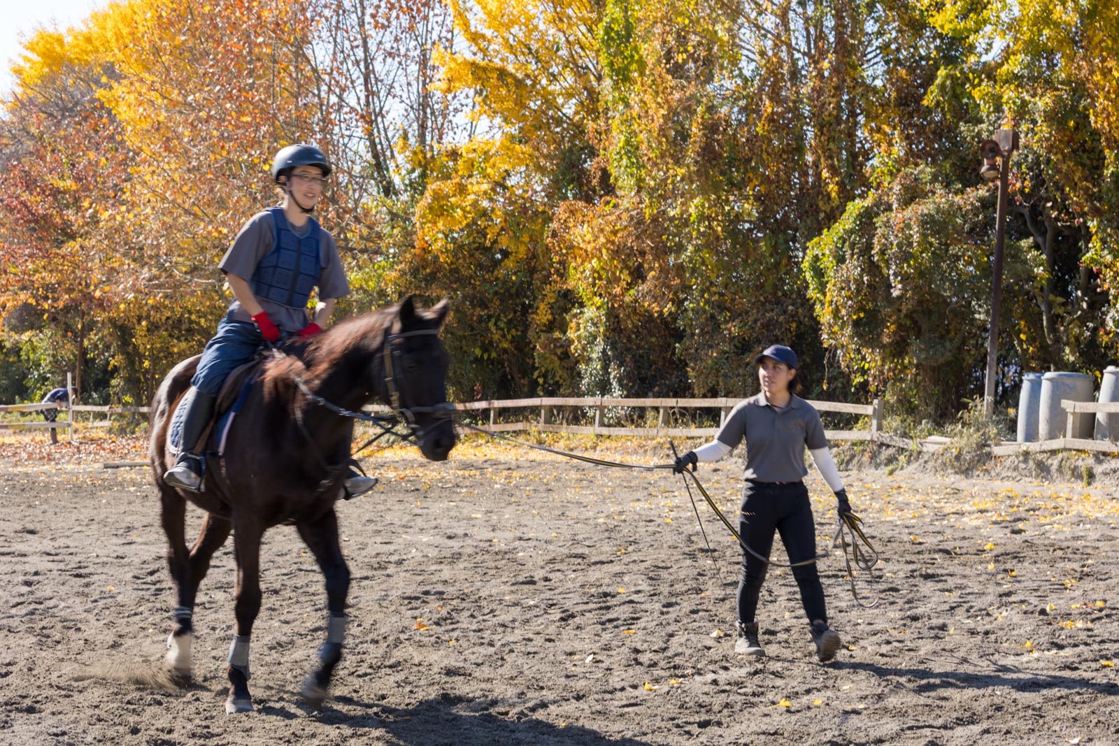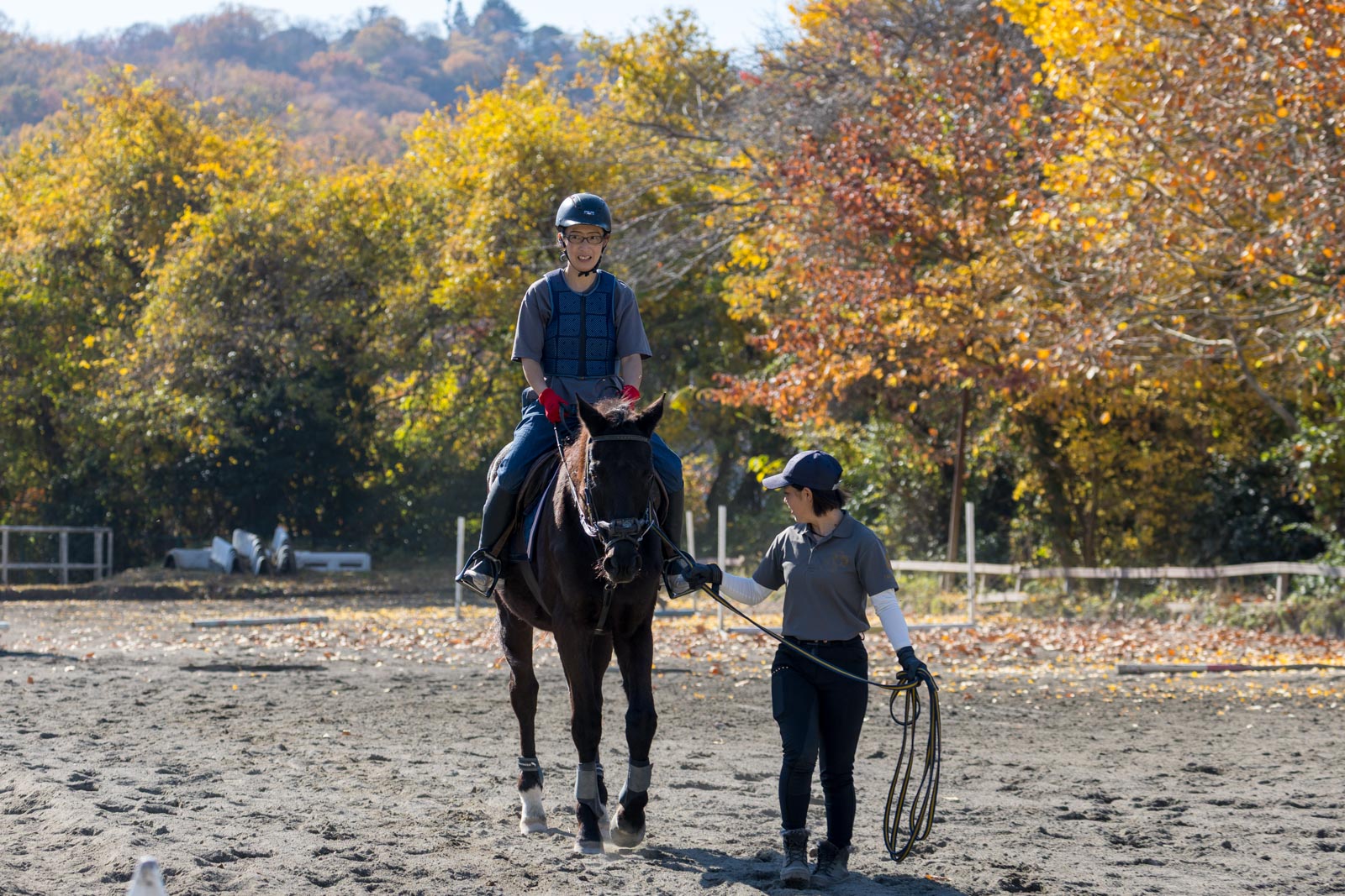 秦野国際乗馬クラブの「体験乗馬」は全4回のプログラム。最終的にはインストラクターが紐で誘導をせず、自分の操作だけで速歩ができるのを目標にレッスンを行います。