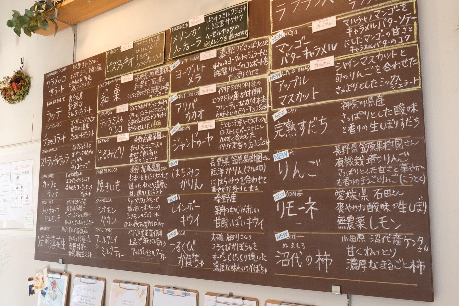 まず目を引くのは、壁一面に書かれた大きな黒板メニューです。販売されている全28種類のジェラートの特徴が丁寧に手書きされており、無意識のうちに好きな素材や果物を探していることに気が付きます。これだけの中から好みの品を選ぶことの難しさたるや。この品定めの時間も存分に楽しみましょう。