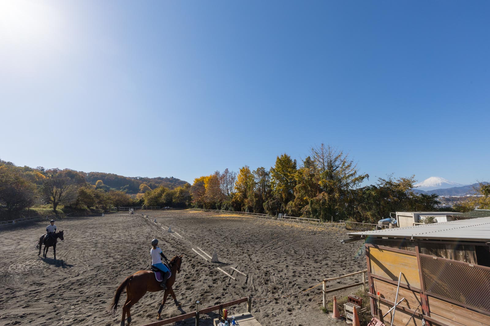目の前に広がる馬場は20m×60mが2面と、20m×40mが1面。そのほかにポニーリンクもあります。ふと景色の開けたほうに目を向けると、堂々とそびえる富士山が。秦野ならではの豊かな自然に囲まれて乗馬を楽しむなんて、まさに贅沢そのものです。