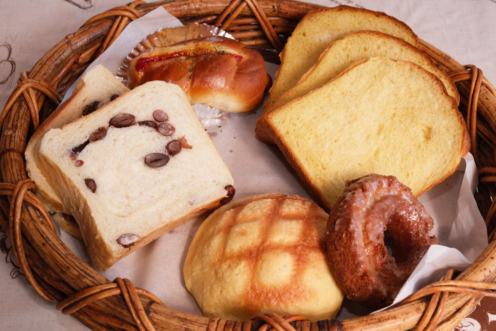 ロングセラーで人気のパンを教えていただきました。左から時計回りに、大粒かのこがたっぷり入ったその名も「大納言ブレッド」、自家製の無添加ソーセージ入りの「ウインナーロール」、ほんのり甘く仕上げた黄色い生地が特徴の「パンプキン」、大山参道にある湧水工房の絹豆腐を使った「大山豆腐リングドーナッツ」、こちらも大山豆腐が入った「大山豆腐メロンパン」です。